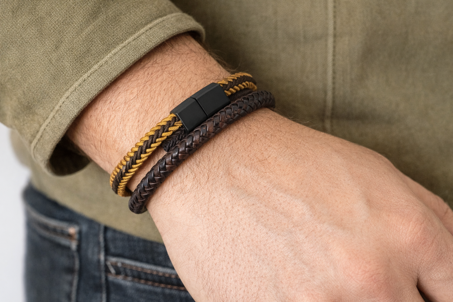 Çift Örgü Deri Erkek Bileklik